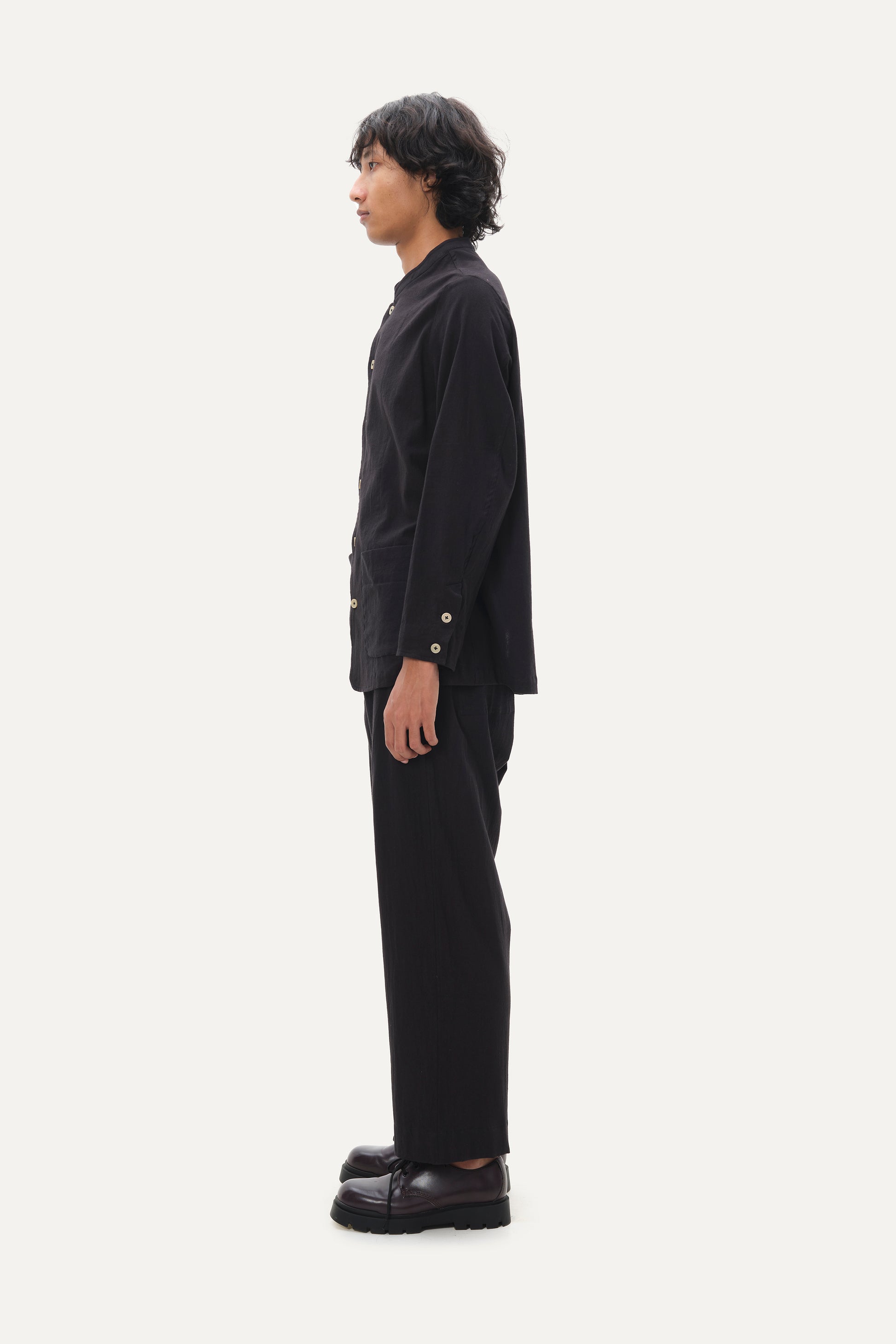 Nehru collar shirt with full sleeves and front patch pockets. Paired here with black pleated front pants with slant pockets. This garment is manufactured using fine and delicate materials, carefully crafted by our artisans across India.- Crushed Cotton- Made in PondicherryFor any customization and inquiries, please contact or WhatsApp at +91 9655.488.288