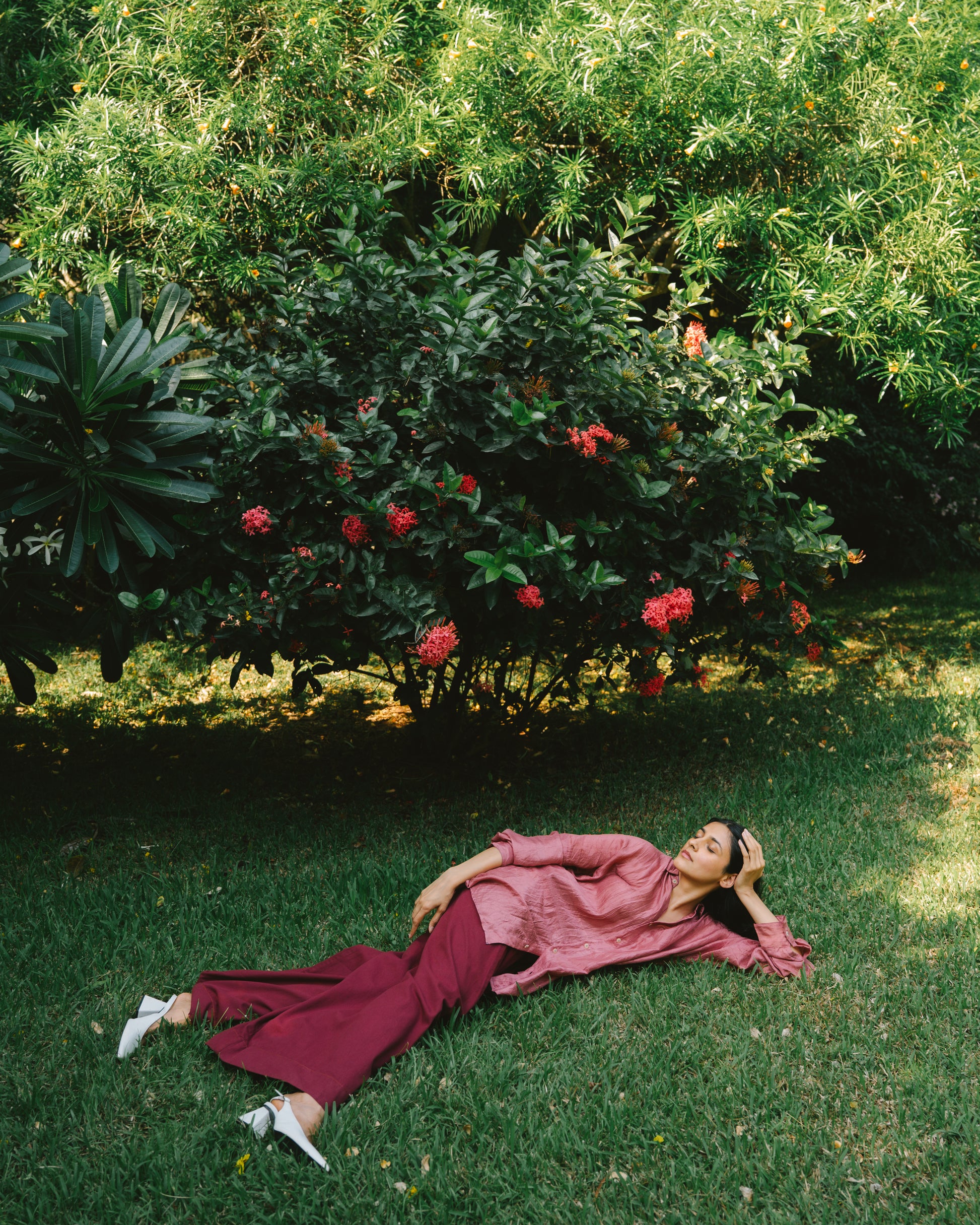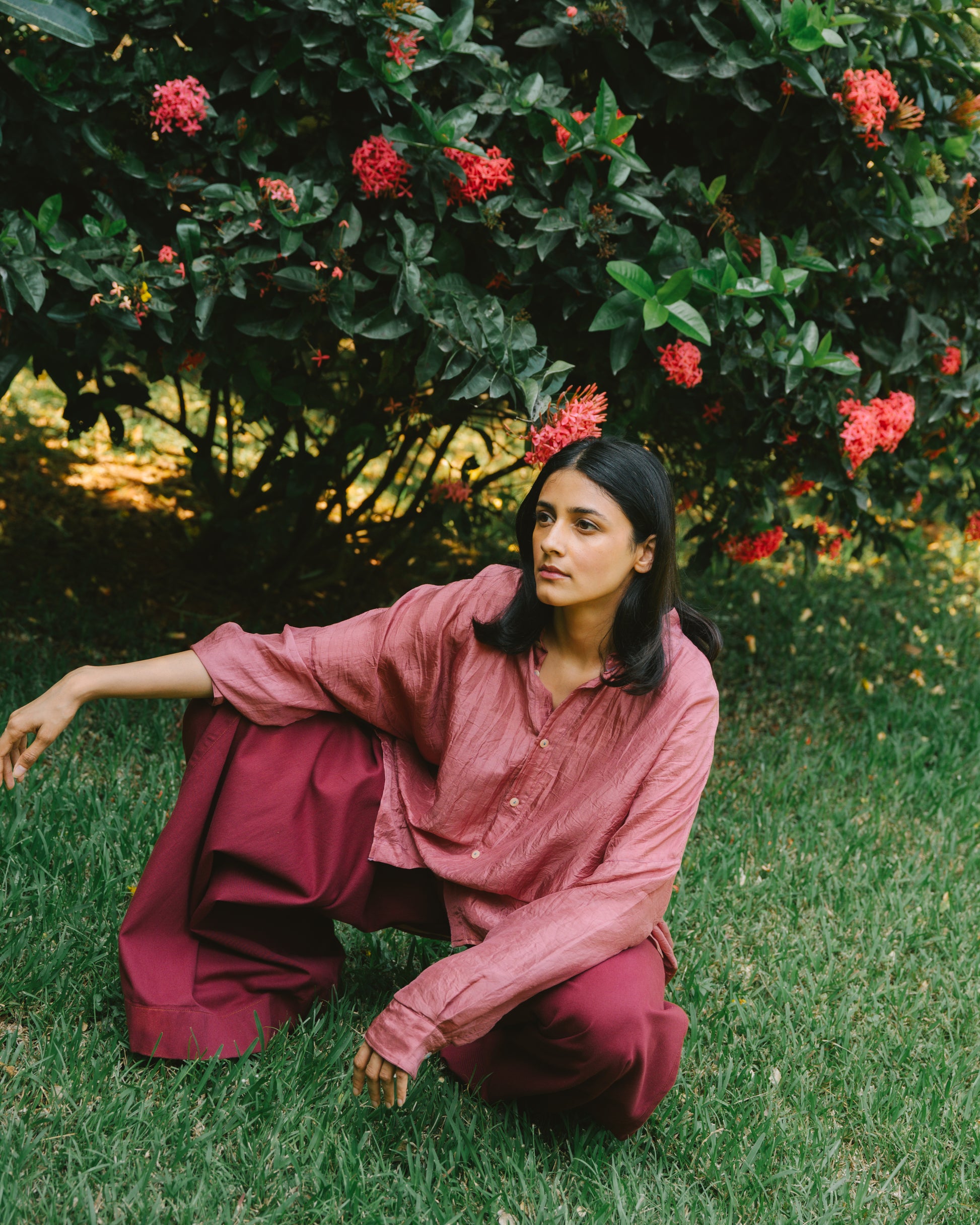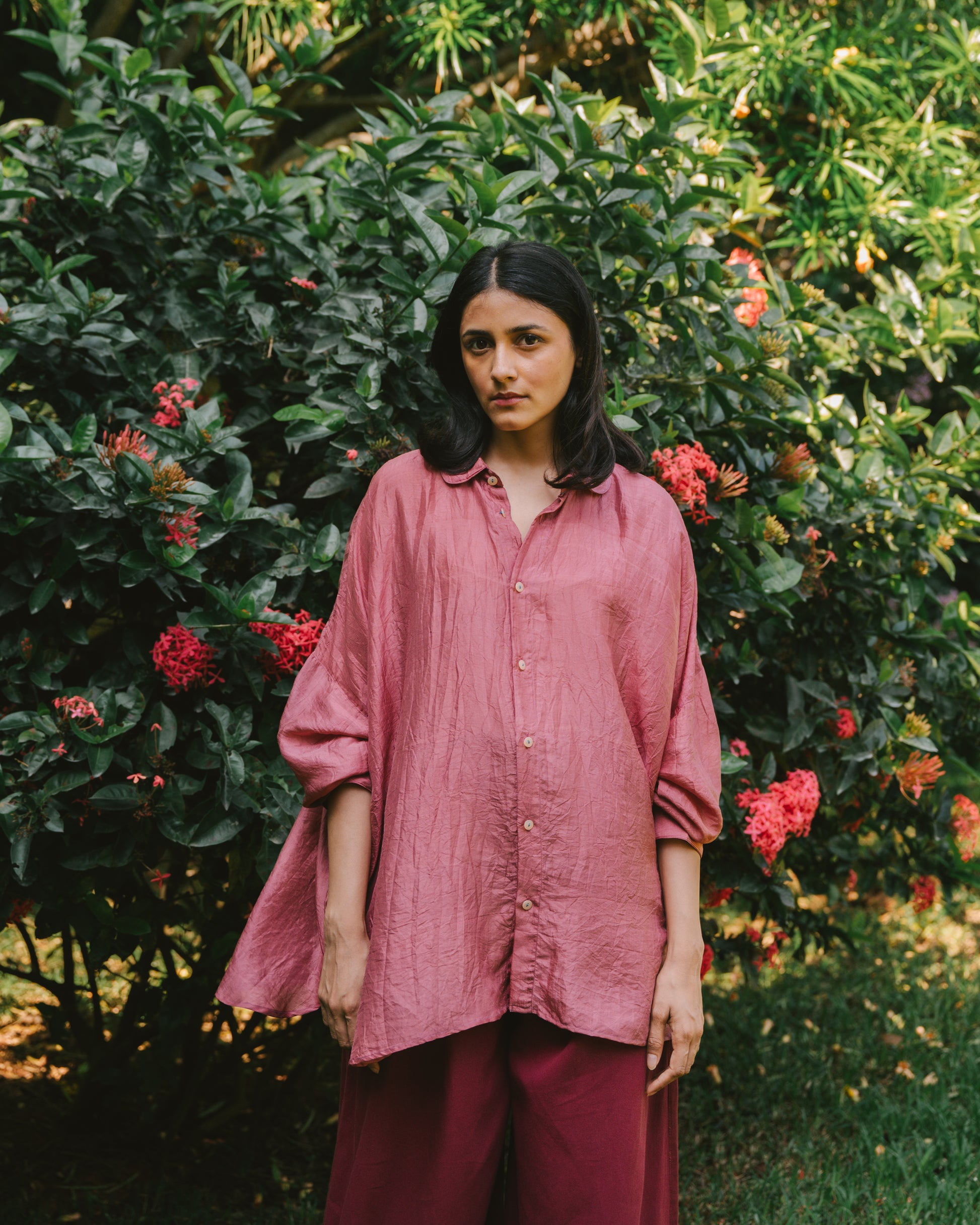 A Dropshoulder Silk shirt with front button details. Made with Handwoven Mulberry silk.