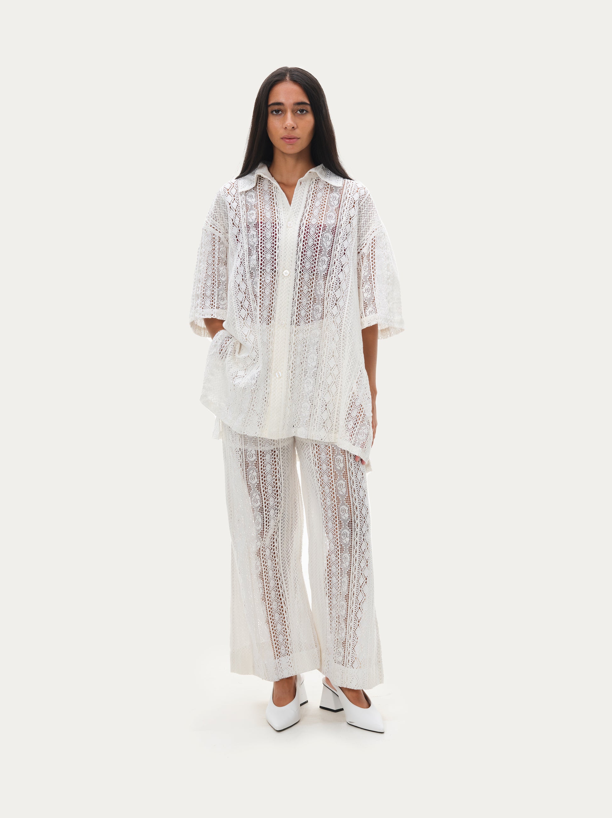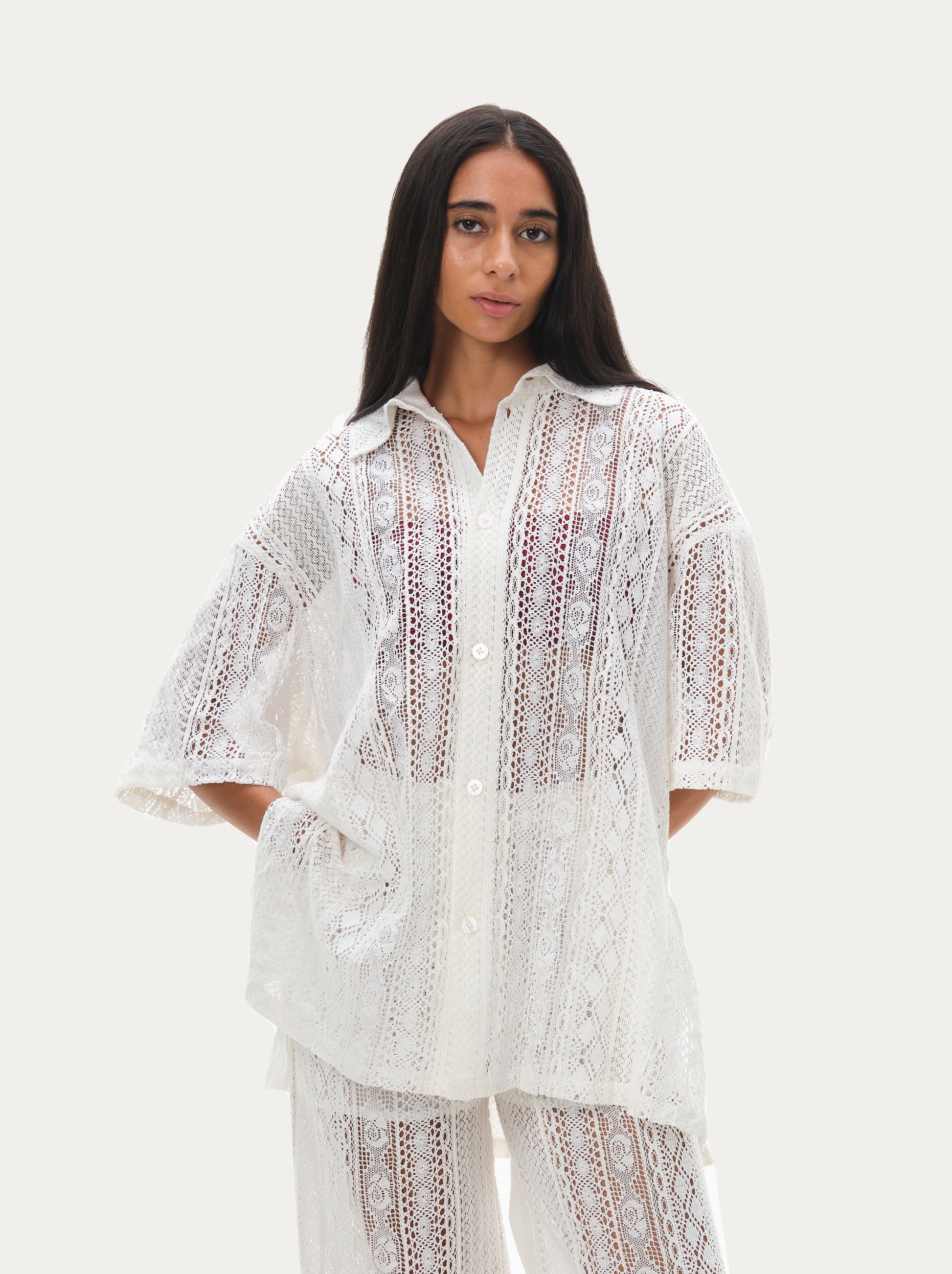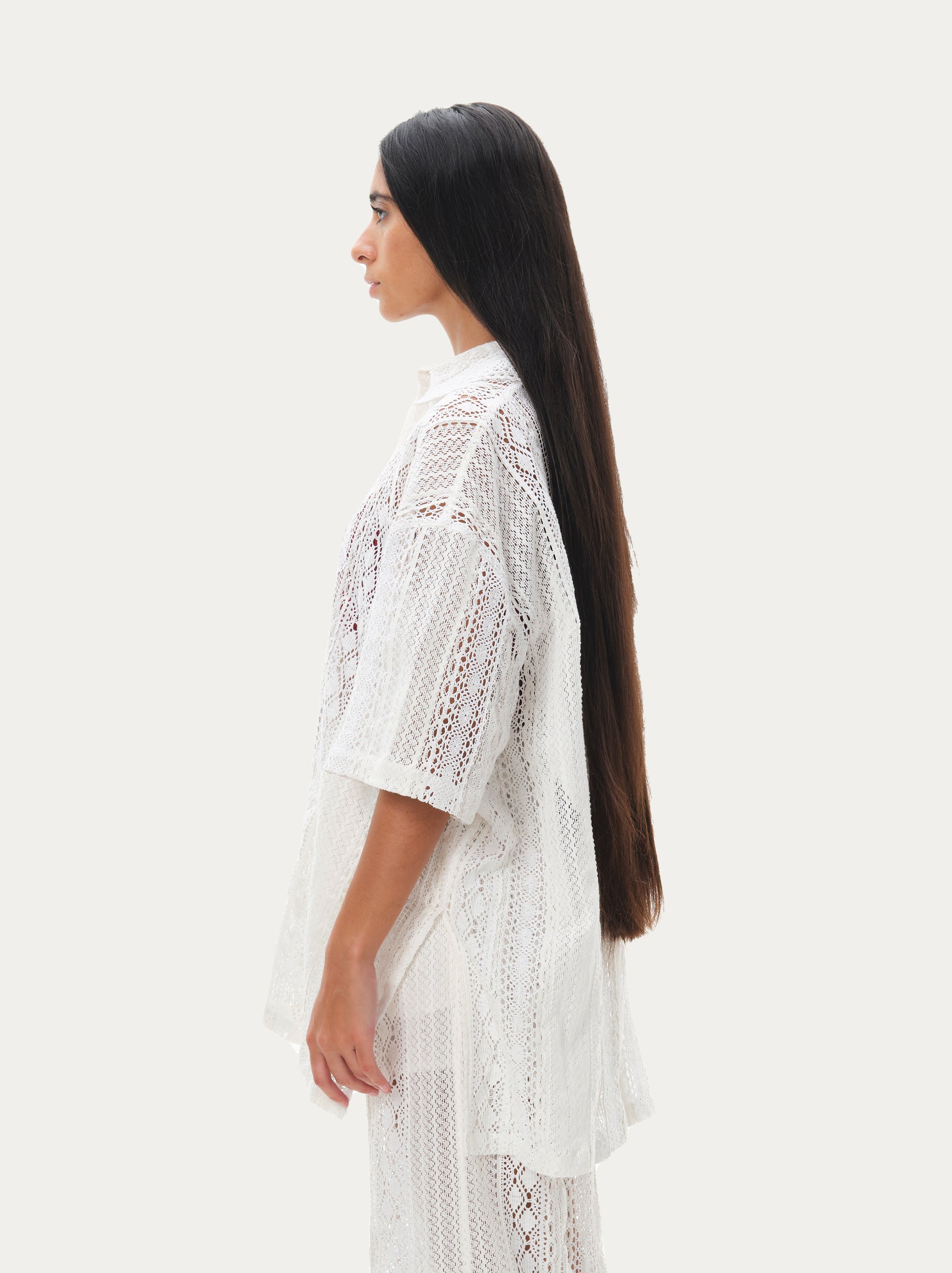 Panelled lace button-down shirt with short sleeves. This garment is manufactured using fine and delicate materials, carefully crafted by our artisans across India.