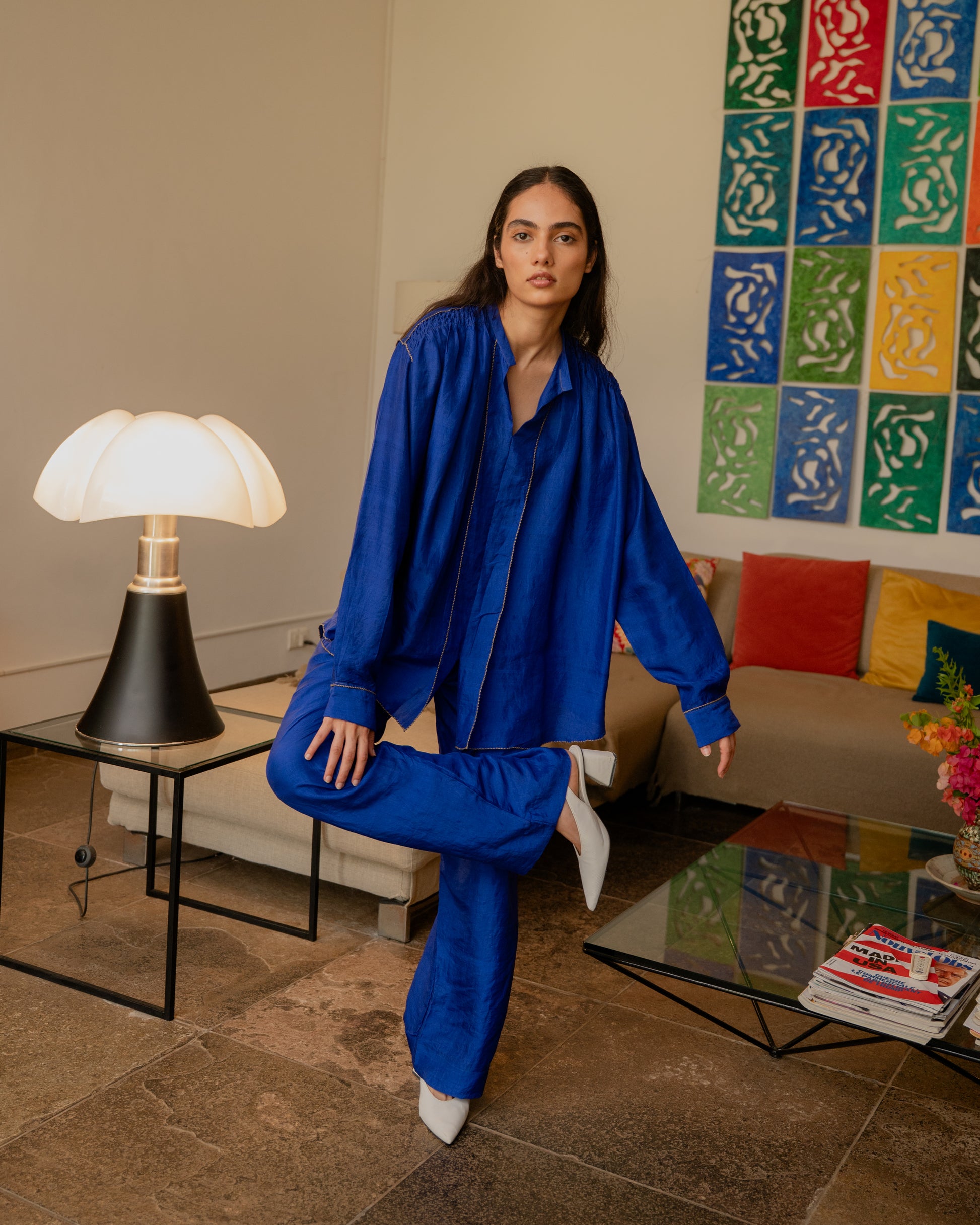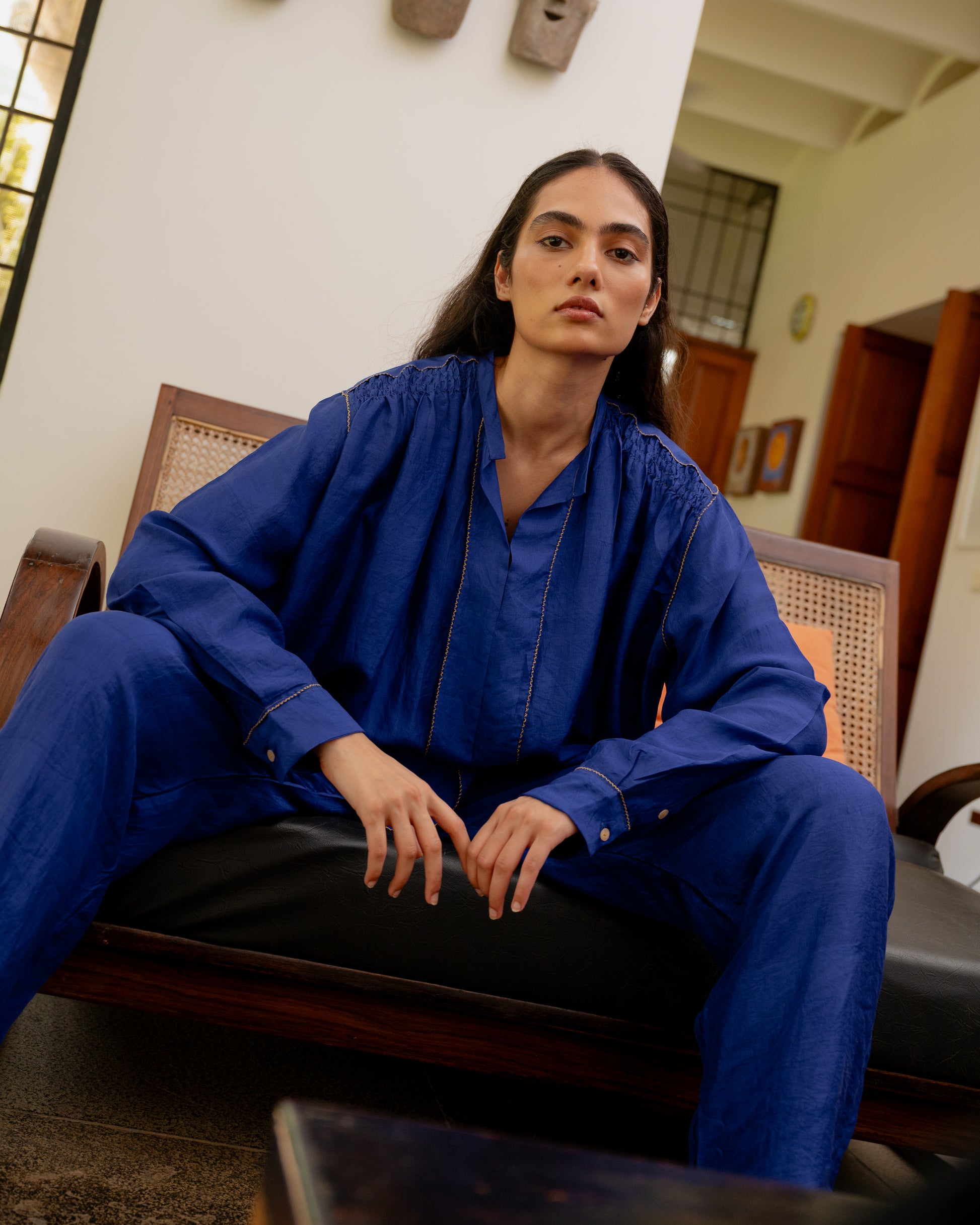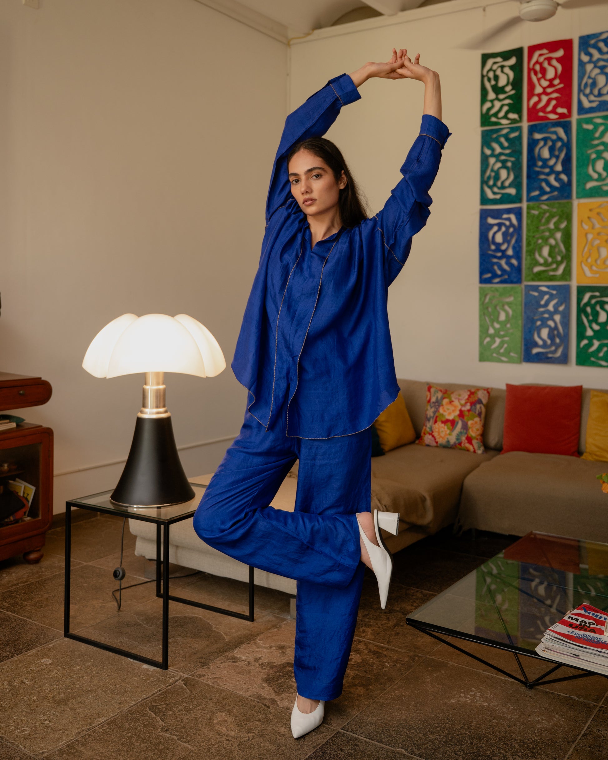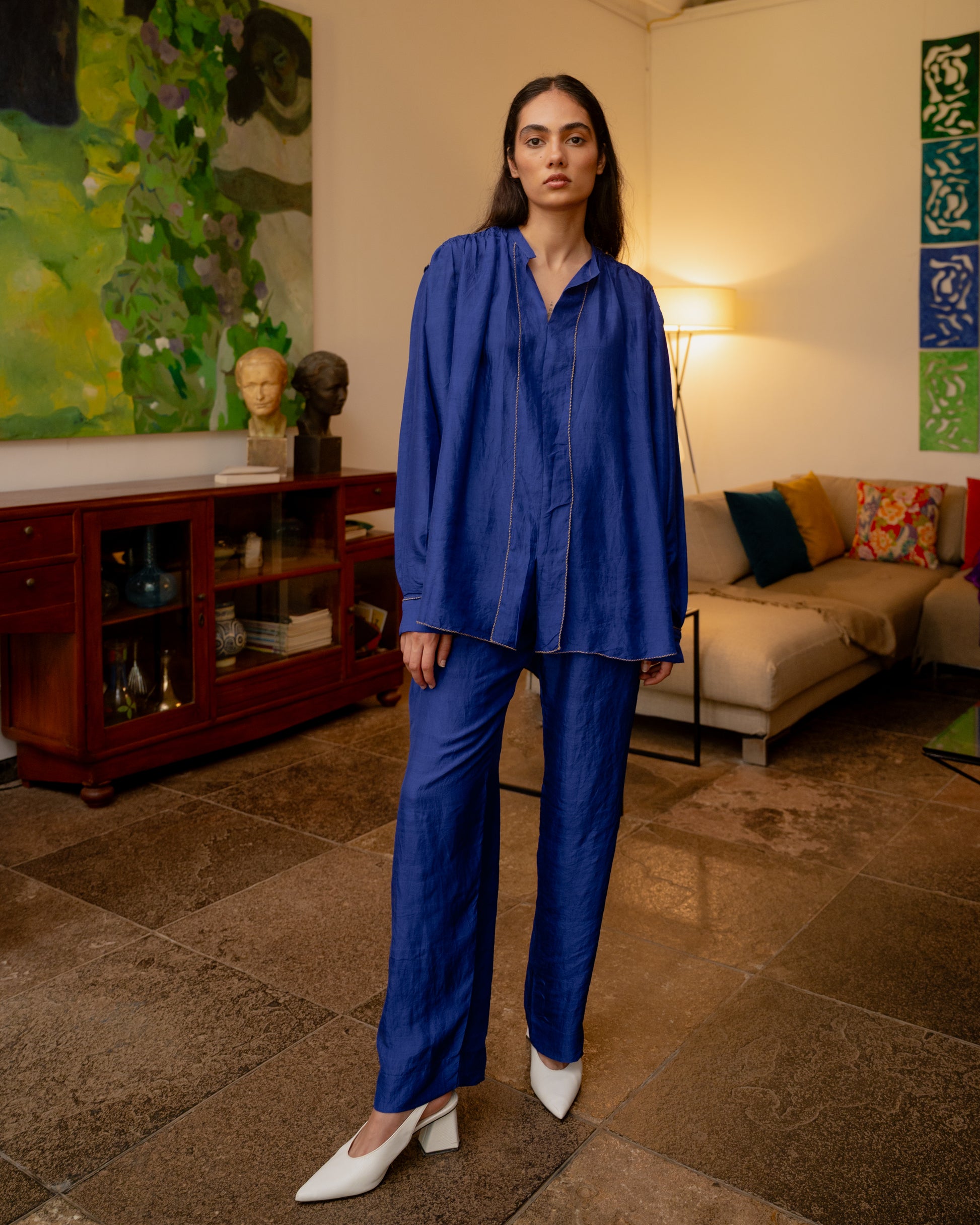 Boxy Mulberry Silk shirt with Cross stitch details in contrast tone.