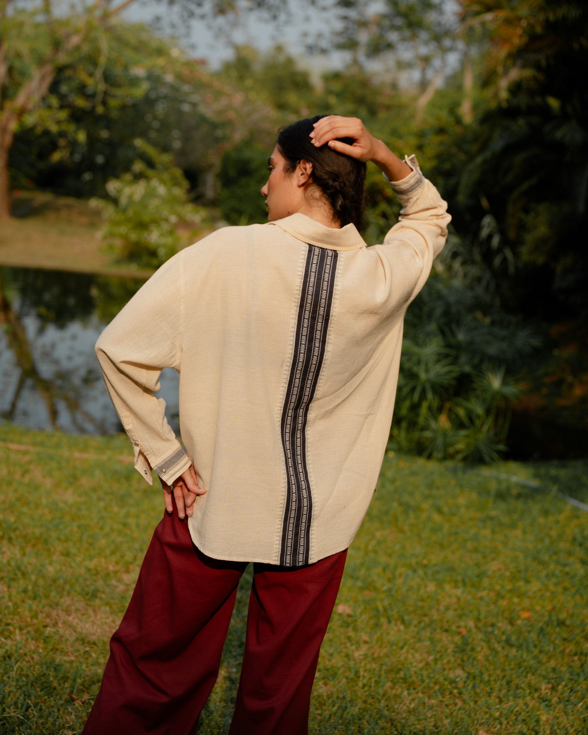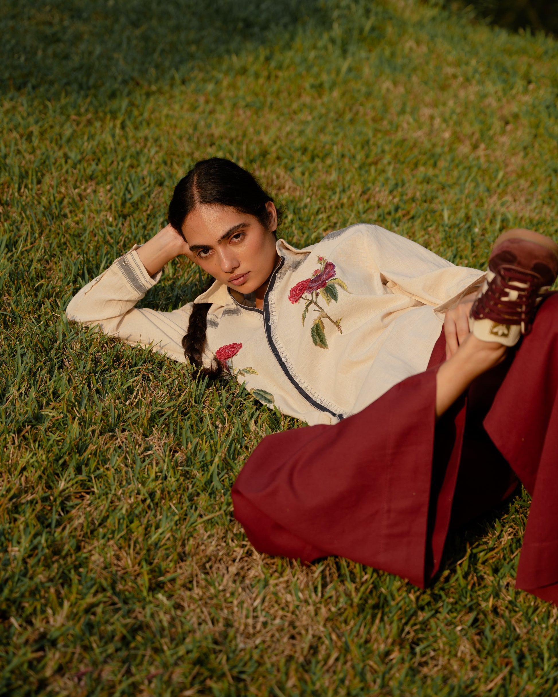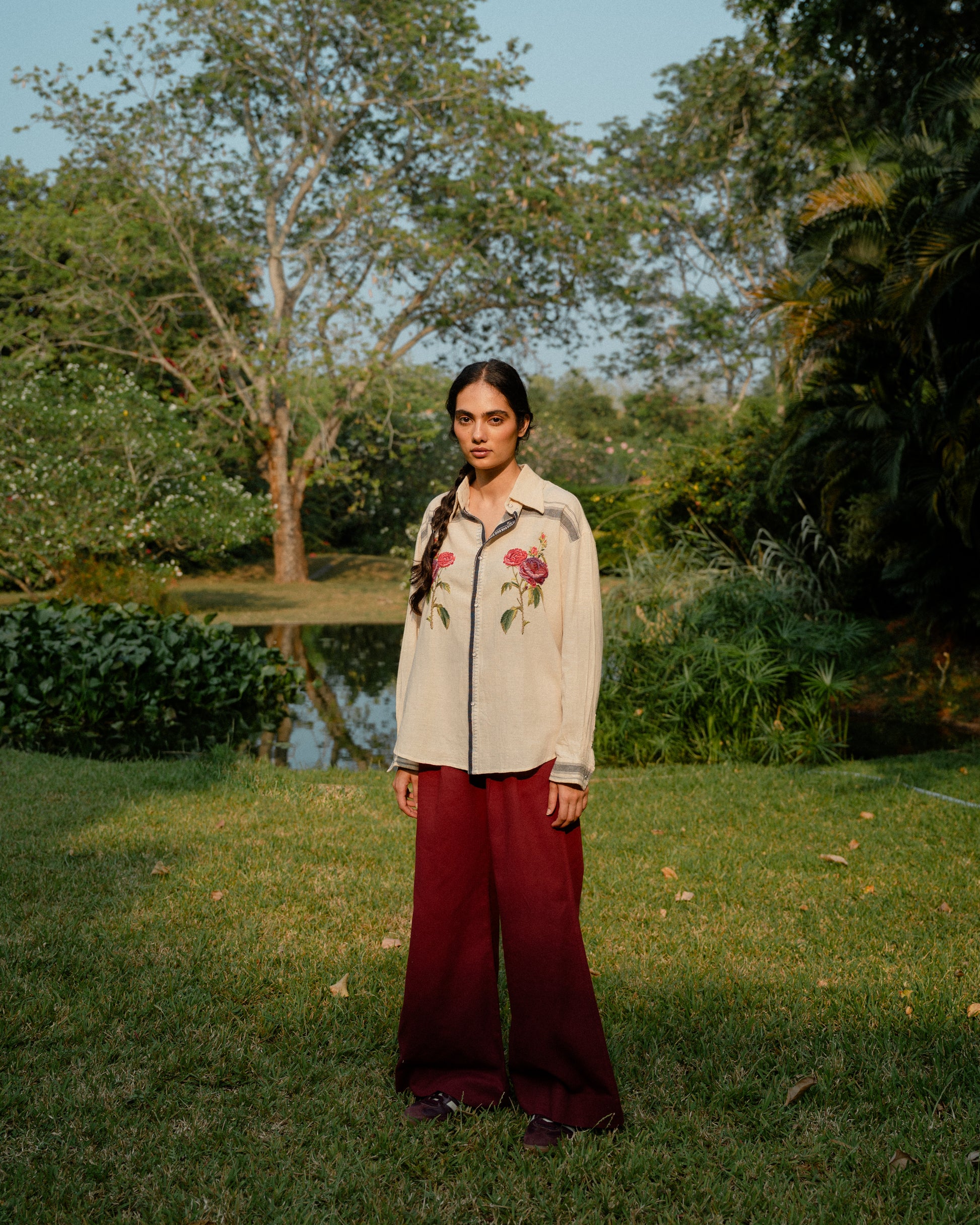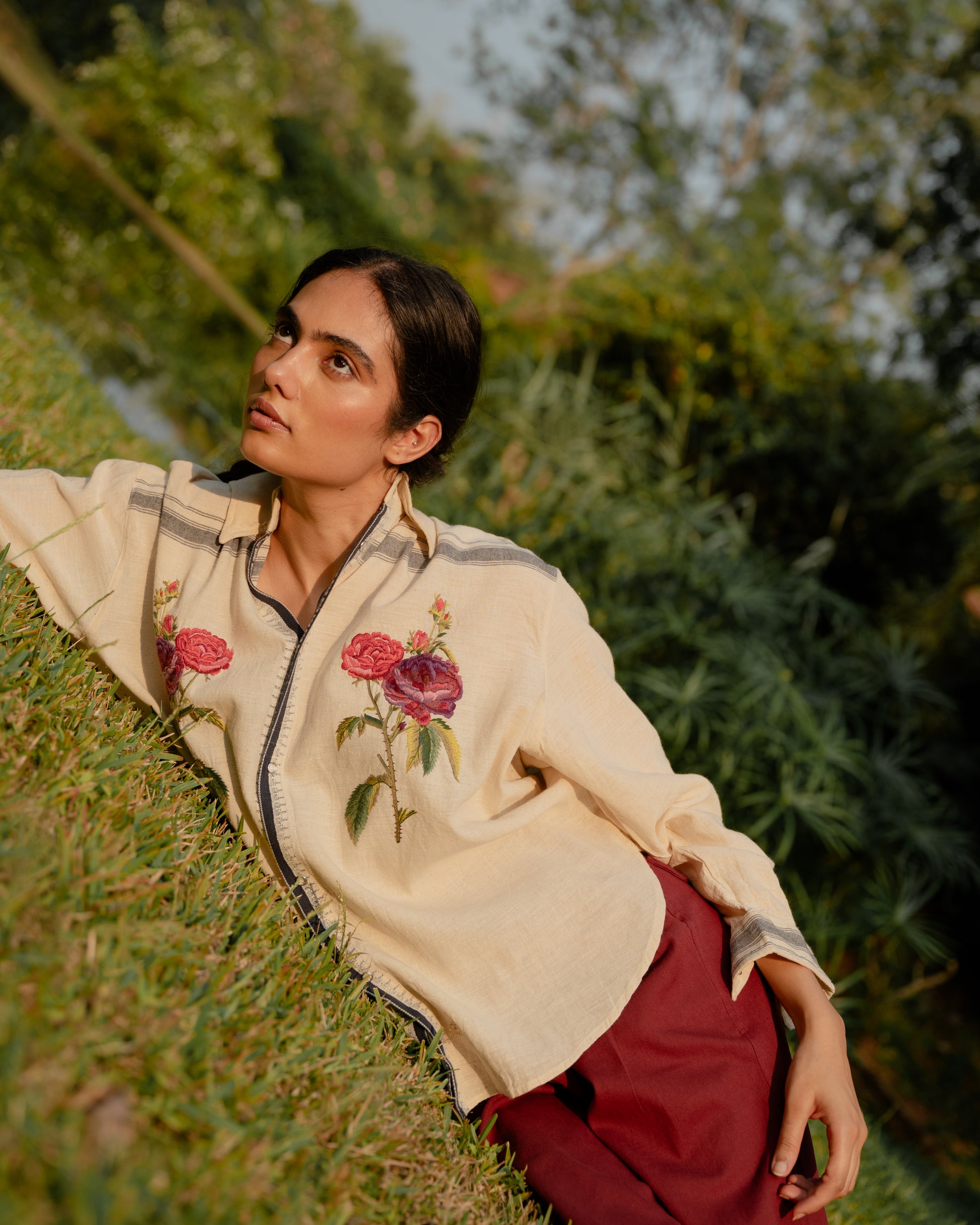 Drop shoulder free size shirt with our signature hand embroidered Rose.